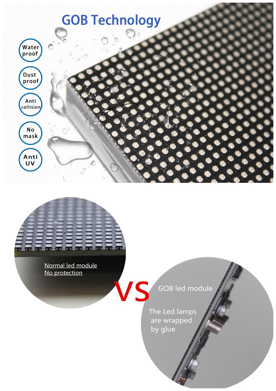 GOB হল Glue On Board এর সংক্ষিপ্ত রূপ, এটি LED ডিসপ্লে মডিউলের একটি নতুন এনক্যাপসুলেশন প্রযুক্তি। যা কার্যকর সুরক্ষা তৈরি করতে সাবস্ট্রেট এবং এর LED প্যাকেজিং ইউনিট প্যাক করার জন্য সবচেয়ে উন্নত স্বচ্ছ উপাদান ব্যবহার করে। এই উপাদানটির শুধুমাত্র সুপার উচ্চ স্বচ্ছতা পারফরম্যান্সই নেই, তবে সুপার তাপ পরিবাহিতা ও রয়েছে। এই প্রযুক্তি LED ল্যাম্প সুরক্ষার সমস্যাগুলি সমাধান করতে পারে। GOB পণ্যগুলি কার্যকর সুরক্ষা থেকে সাবস্ট্রেট এবং এর LED প্যাকেজিং ইউনিট এনক্যাপসুলেট করতে স্ব-উন্নত স্বচ্ছ আঠালো উপাদান ব্যবহার করে। GOB প্রযুক্তি LED ডিসপ্লে স্ক্রিনটিকে স্পর্শযোগ্য, আর্দ্রতা প্রতিরোধী জলরোধী, ধুলো-প্রমাণ, প্রভাব প্রতিরোধী এবং সংঘর্ষ-বিরোধী করে তোলে। LED ডিসপ্লে বিভিন্ন কঠোর পরিবেশ ব্যবহার করা সম্ভব।